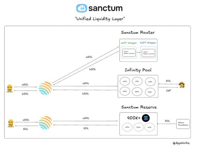 必要時,這些 Swap 也可以導流到 Infinity Pool,其這可以被視為一籃子由 Sanctum 管理的 LST 組合,且所有這些 LST 都在 Sanctum 的 LST 發行基礎設施下運作。當 Swap 被導流進入 Infinity 時,交易費用將分配給 Infinity Pool 的流動性提供者(即 $INF 持有者)。