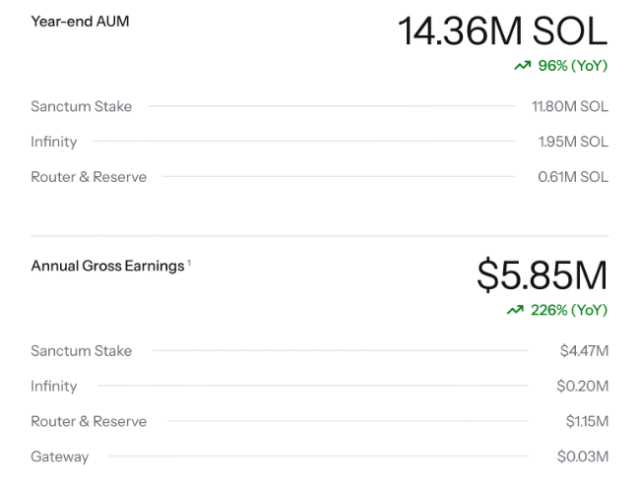在不到兩年的時間裡,Sanctum 已經和 Bybit、Crypto.com、Backpack、Jupiter 等領域內的主要參與者合作,管理著超過 20 億美元的 $SOL。截至 2025 年底,Sanctum 以創紀錄的指標結束了該年度:總管理資產達 1,436 萬顆 SOL(年增 96%),年營收達到 585 萬美元(年增 226%)。