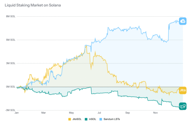 另一個令人印象深刻的指標是 Sanctum 在 2025 年對 Solana LST 類別的統治力;Sanctum 實現了近 800 萬顆 $SOL 的淨累積流入,而其兩大競爭對手 Jito 和 Marinade 的 LST 產品則以淨流出結束了這一年。這種差距凸顯了 Sanctum 在 LST 市場中流動性護城河的複利競爭優勢。