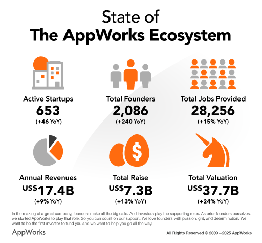 2010 年成立,AppWorks Accelerator 每半年遴選最具潛力的團隊加入,協助創業者從 0 到 1 找到 Product-Market Fit、並在成長階段建立可持續與可擴張的商業模式。截至目前,AppWorks 生態系共有 653 家活躍新創、2,086 位創業者;其中包含 288 家 AI 新創、600 位 AI 創業者,以及 156 家 Web3 新創、424 位 Web3 創業者。這些公司合計已募得 73 億美元,總市值 377 億美元,共同創造 174 億美元年營收,並提供 28,256 個工作機會。我們的新創社群分佈於台灣、印尼、新加坡、馬來西亞、越南、菲律賓、韓國、日本與香港等九大市場,陪伴創業者打造跨市場、具長期競爭力的事業。