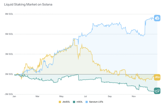 Another impressive metric to look at is Sanctum’s dominance of the Solana LST category in 2025; Sanctum achieved a net cumulative inflow of nearly 8M $SOL, while its two largest competitors, Jito and Marinade, saw their LST offerings end the year with net negative inflows. This disparity underscores the compounding competitive advantage of Sanctum’s liquidity moat within the LST market.